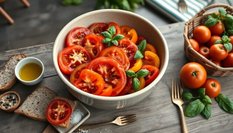 – 6–8 heritage tomatoes, a mix of shapes and colors, room temperature – 6 tbsp extra‑virgin olive oil – 2 tbsp lemon juice or a mild vinegar (plus a teaspoon aged balsamic, optional) – 1 small shallot, paper‑thin slices – A handful of fresh basil, torn – 1 cup toasted country bread cubes or 3 tbsp toasted seeds – Flakes of sea salt and freshly ground black pepper