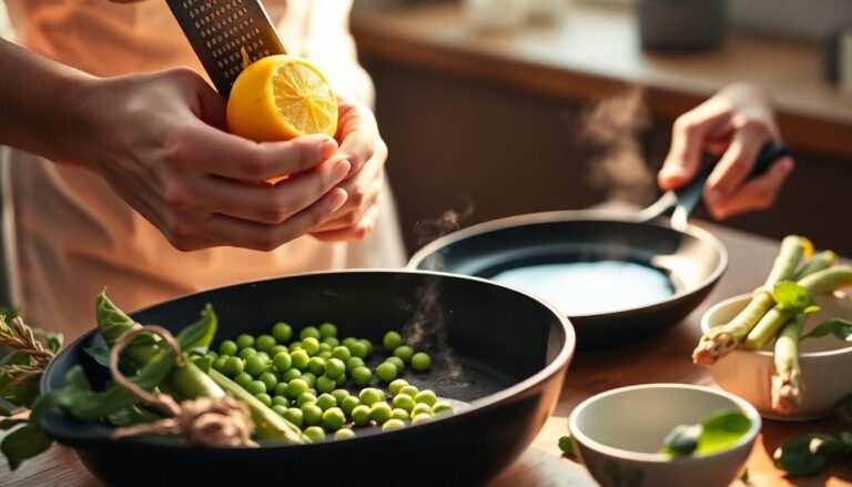 Blanch-and-shock: For peas and green beans, plunge briefly into salted boiling water, then transfer to ice water. This arrests cooking and preserves vivid color and fresh sugars. Warm the vegetables briefly in a light butter emulsification or high-quality olive oil to coat each piece with a silky finish.